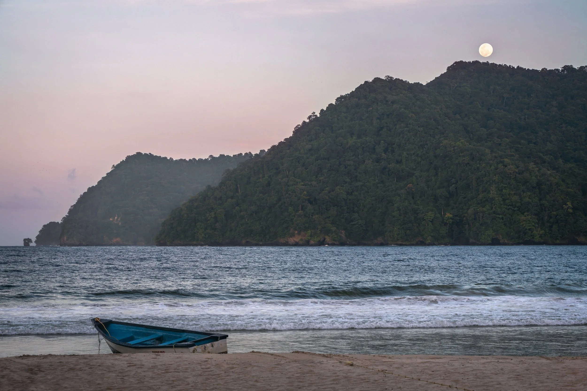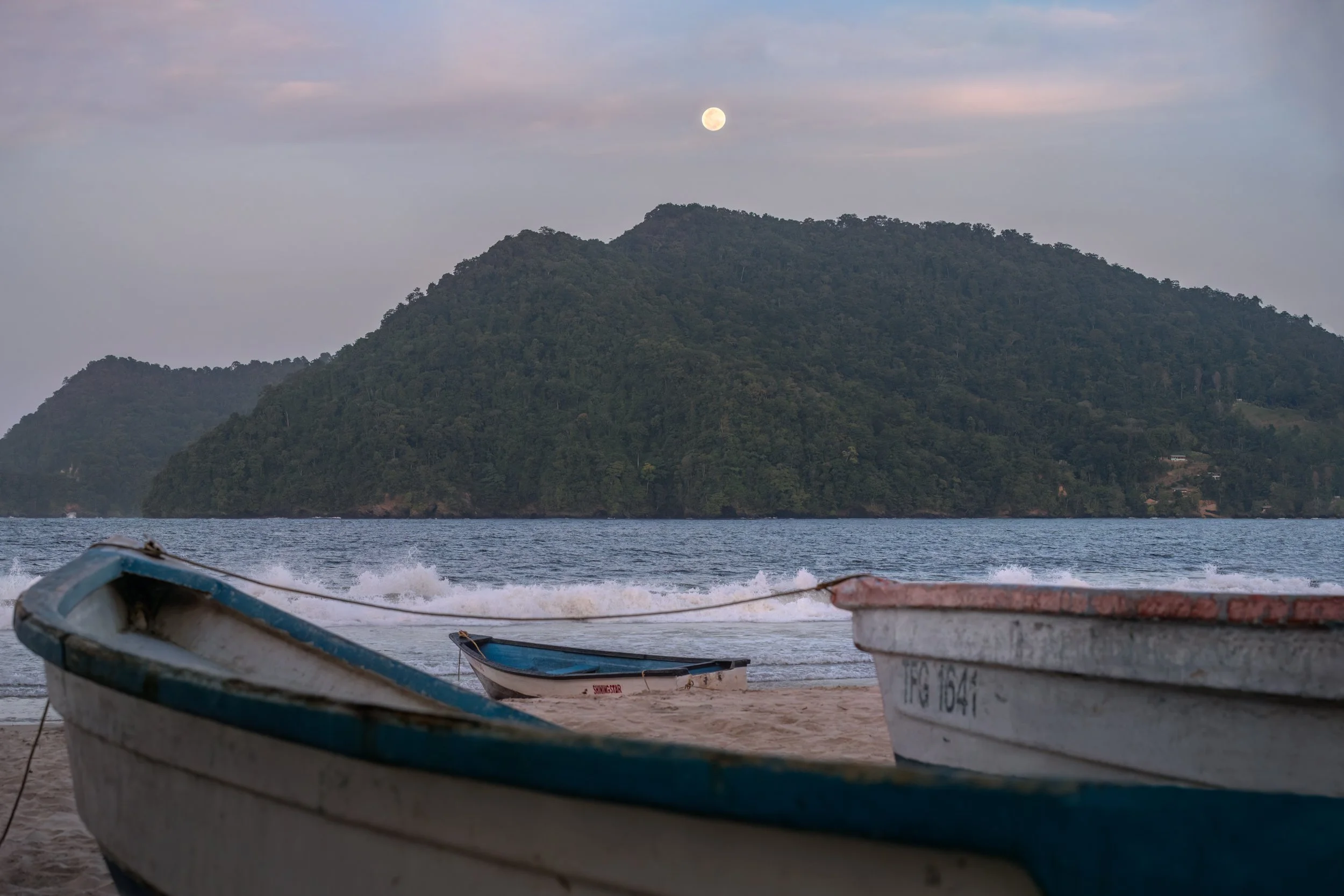 Image (iii) Framed serenity. Framing the serene scenes at Maracas Bay on that wondrous evening. I really was targeting the composition shown in Image iii, I found it so delightful with all elements in the frame perfectly arranged to my satisfaction. While doing so, I managed to glance at the pier in the distance shown in Image ii to witness this couple at the head of the pier enjoying the view and taking in the moment. I promptly abandoned my first composition and framed the scene showed in Image ii as I could not pass up the moment of these two in the frame. Clearly they understood the assignment and were living in the moment enjoying the moonrise. They spent quite some time there and I really had to wonder what conversations they had with the moon. After capturing them and the wider scene to my heart’s content, I returned to the original framing. It all worked out well because shortly thereafter reframing the shot with the tree to the left, boat to the right looking toward the moon and mountain in the distance, the sky with those wispy clouds took on a wonderful hue and pleasing colour to add life to my frame. It lasted a while and was totally unexpected as simply moments before the sky was looking a bit dull. What an evening, one which I can’t forget for the amazing scenes I witnessed.